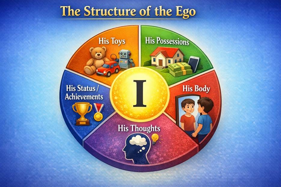 For a child, the ego may identify with a toy. If someone breaks the toy, the child feels miserable—not because of physical need but because the toy has become an extension of his identity.