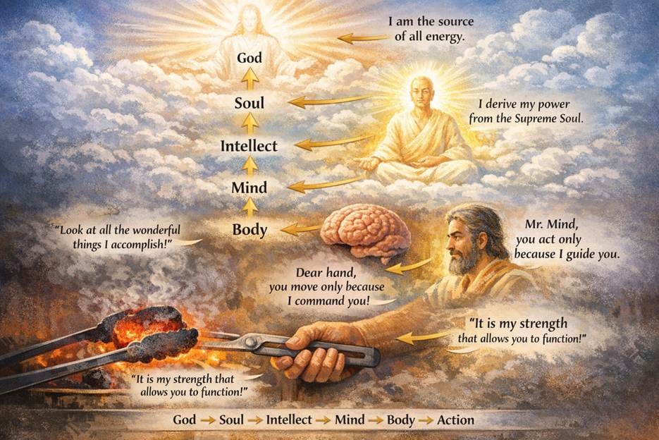 Yet even the intellect is not independent. All these faculties derive their power from the soul. And the soul itself receives its energy from the Supreme Soul—God. Thus, the chain of power is clear: