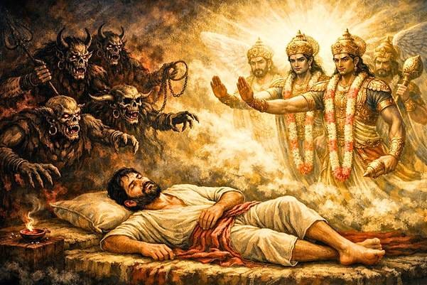 At the time of death, the mind naturally gravitates towards that to which it is most attached. Ajamil, absorbed in thoughts of his son, called out “Narayan!”—and lost consciousness. In that moment, he witnessed a startling vision. From one side came the Yamaduts (messengers of Yamraj)—grotesque and fearsome. “He is a sinner,” they declared. “Take him for punishment.” From the other side appeared the Vishnuduts (messengers of Lord Vishnu)—radiant beings, adorned with divine ornaments. They intervened, “Do not touch him.”