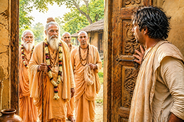 One day, a group of sages arrived in the village. They followed a strict rule—to spend the night only in the home of a devotee of Vishnu. As they inquired about who among the villagers was a Vaishnav, someone mischievously directed them to Ajamil. Taking this at face value, the sages went to his house and knocked. When Ajamil opened the door and saw their holy attire, he was taken aback. He felt deeply unworthy of such exalted company. The saints asked, “We heard you are a devotee. May we stay here?” Ajamil was conflicted. On one hand, he knew he was undeserving; on the other, a thought arose—If such holy souls stay in his home, perhaps their presence may bring him some auspiciousness. With that hope, he welcomed them.