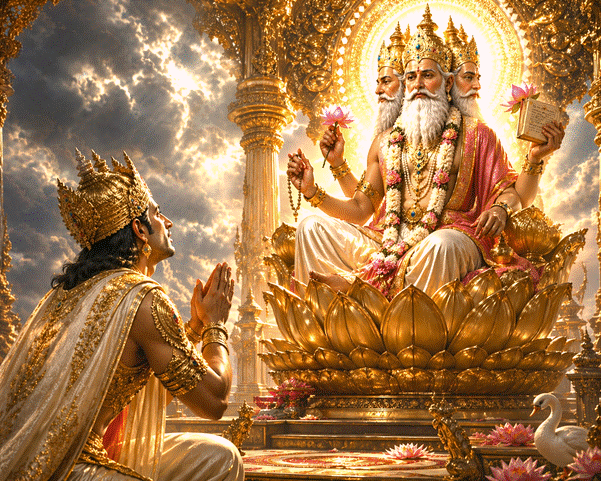 Stripped of his glory, Indra—once intoxicated by pride—now stood humbled. In desperation he approached Srishtikarta Brahma, his voice trembling with desperation: “Brahmaji, how can I reclaim my throne?” Brahma replied, “Seek out Vishwaroop, the pious son of the brahman Tvashta. Entreat him to perform a yajna (fire sacrifice) for you, and he shall bestow upon you the Narayan Kavach.”