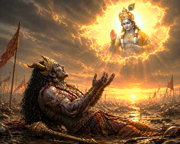 As Indra struck a fatal blow, Vritrasur staggered and his colossal frame collapsed. Yet, in that final moment, something extraordinary unfolded. As life ebbed from him, Vritrasur did not curse, nor did his eyes blaze with hatred. Instead, from his heart arose prayers revealing such depth of devotion one would never expect from a demon.