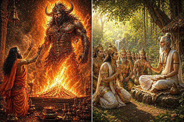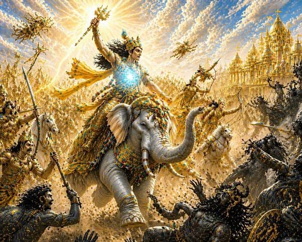 Without a word, Brihaspati turned and left. In time, Indra realized the gravity of his error. Remorse flooded his heart. He went in search of his guru, seeking forgiveness. But Brihaspati, deeming it fit, withdrew from Indra’s sight. And so, Indra returned—bereft of his guru’s darshan and blessings.