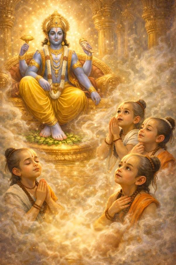 Yet the tale did not end in wrath. In due course, the Kumars passed through the gates of Vaikunth, where an unexpected wonder awaited them. The sacred aroma of Tulsi leaves offered at the lotus feet of the Lord Narayan gently wafted into their nostrils. At once, they were seized with astonishment.