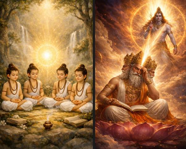In the beginning, with the desire to create, Brahma ji manifested from his mind the four Kumars (manas putras): Sanak, Sanatan, Sanat, and Sanandan. To them he entrusted the task of carrying forward creation. But the Kumars were already supremely enlightened. Reflecting deeply, they discerned that advancing into youth would inevitably invite the distractions of the senses. Choosing instead to remain forever in childhood—brahmacharya avastha—they immersed their minds solely in contemplation of the Supreme. For them, the world held no allure, and thus Brahmaji’s intent was thwarted. It was in that moment of deep disappointment that his brow furrowed—and from his forehead manifested Shankar ji.