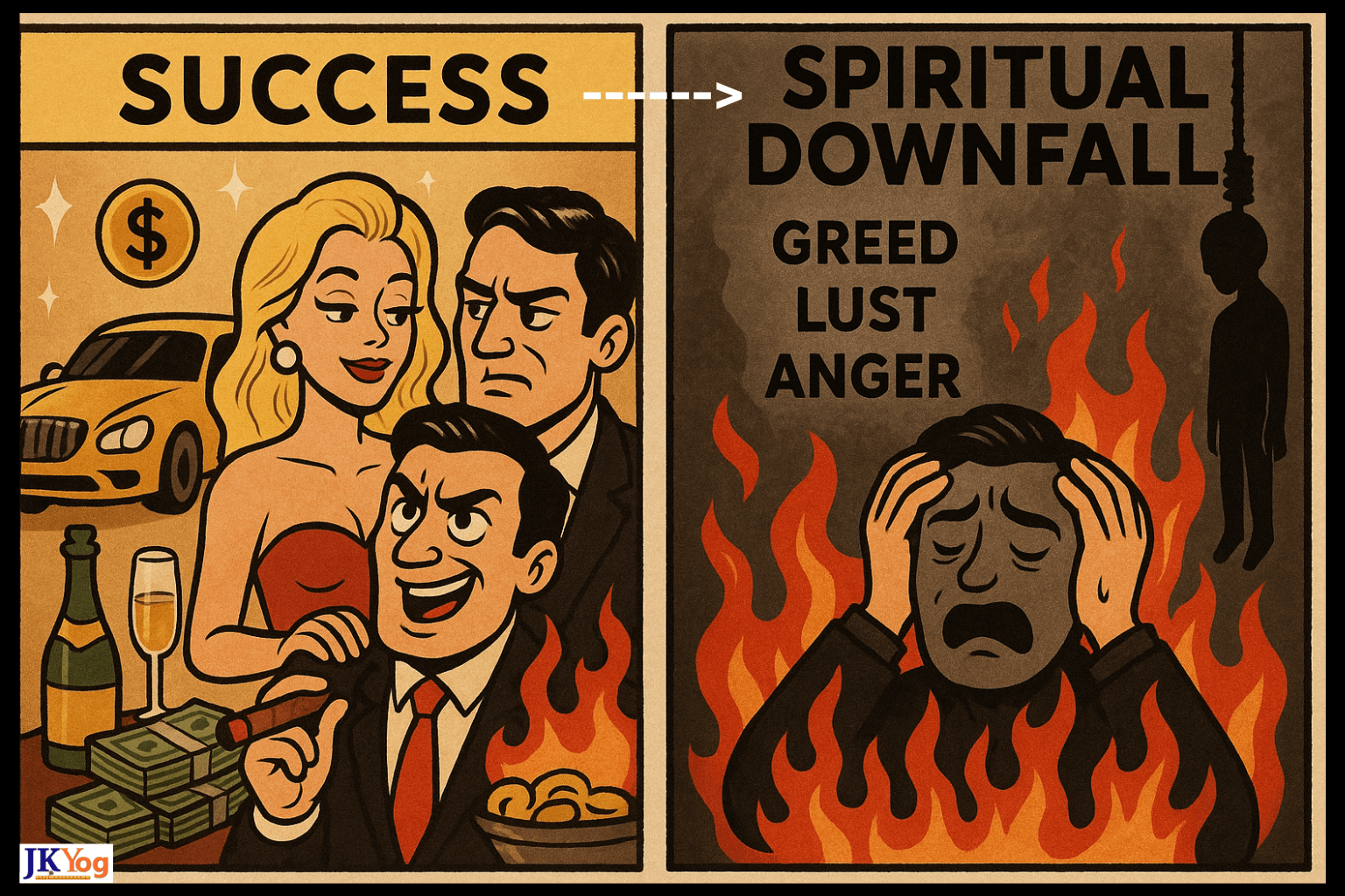 Those who act in accordance with this false belief are likely to live a life consumed by vikarm by engaging in sinful and forbidden activities rooted in greed, lust, and anger. They may enjoy fleeting pleasures, but in doing so, they experience a spiritual downfall and squander the rarest opportunity of all – to appropriately utilize the human birth meant for God-realization. Upon death, such gross materialists end up in asurya realms, shrouded in darkness and ignorance. They are deprived of sunlight (i.e., vidya) and filled with tamasic vrittis or proclivities, leading to atma hanah or suicide of the soul.