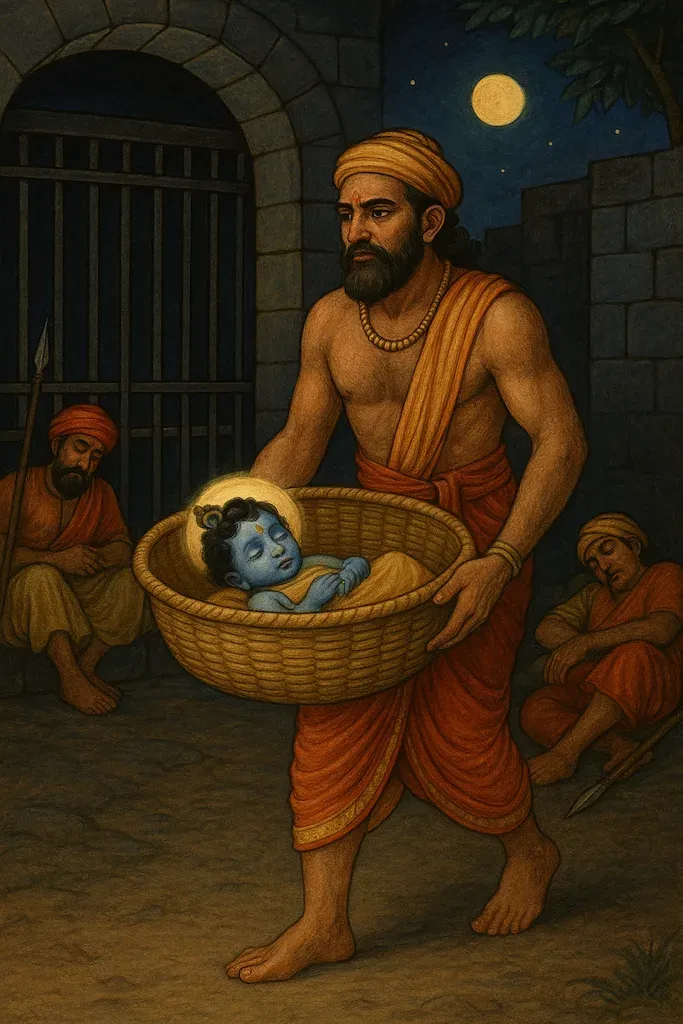 Following Shree Krishna’s instructions, Vasudev prepared to carry the infant Shree Krishna to the safety of Gokul. What followed was a series of breathtaking events. The prison guards fell into deep sleep, the locked doors swung open, and Vasudev, carrying Shree Krishna in a basket, stepped into the night. The monsoon rains fell gently as he reached the banks of the Yamuna River.