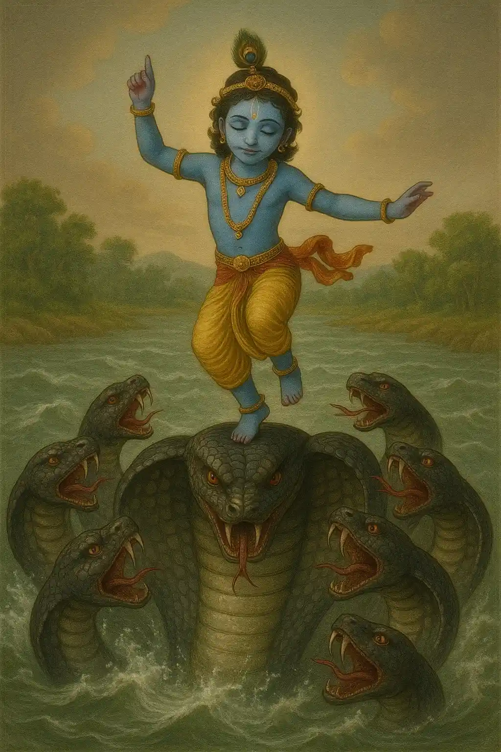 The Yamuna was once rendered lifeless by the venom of the serpent Kaliya, whose presence turned the river dark and still. None dared enter its waters. But Krishna leapt in, confronted the monstrous serpent, and danced on his hoods until the proud creature submitted.