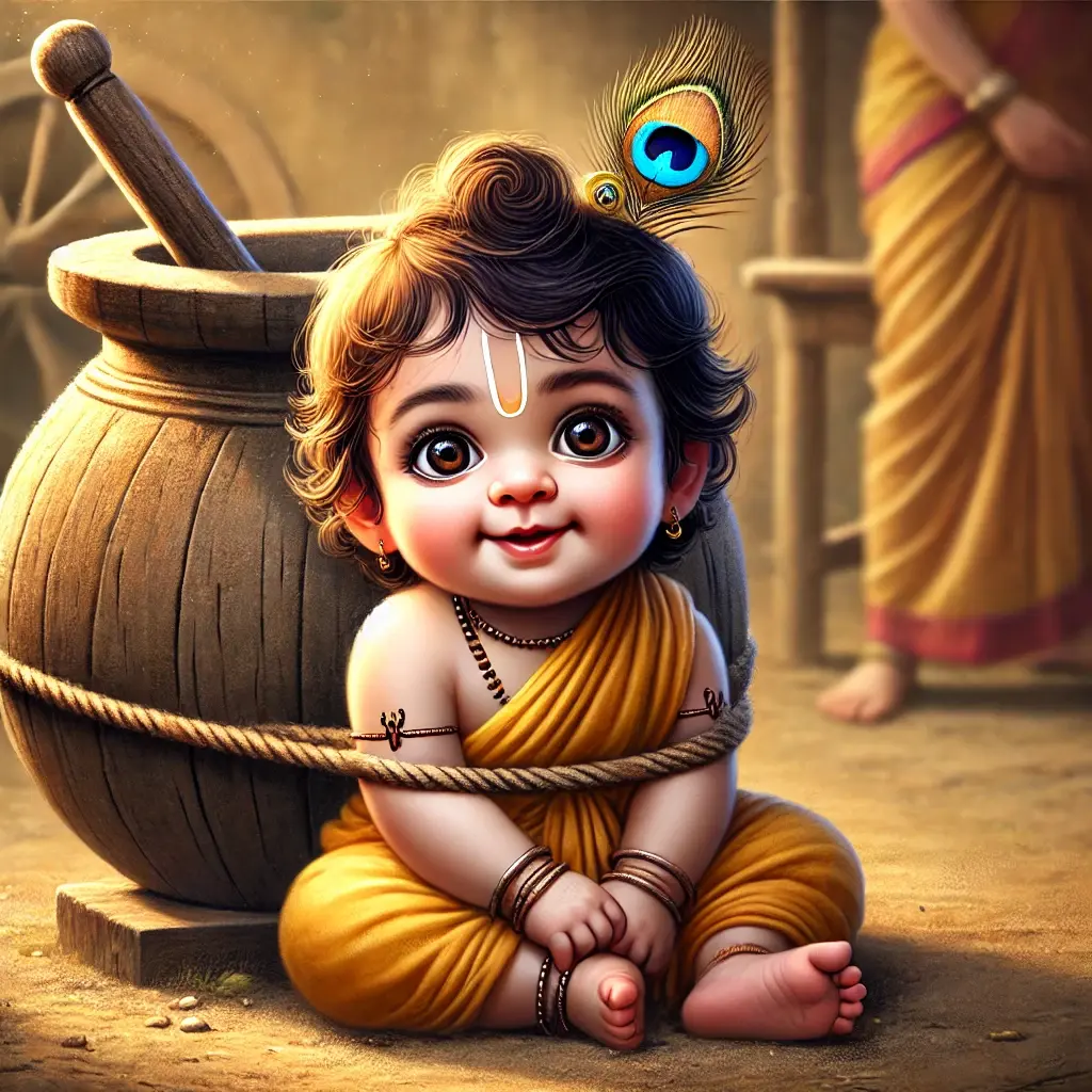 One day, Krishna broke pots and fed butter to monkeys. When Yashoda returned, she found utter chaos. Infuriated yet overwhelmed with love, she chased Him with a stick. As the Divine Child trembled, ran, and finally slowed down seeing His mother panting, a most endearing moment unfolded.