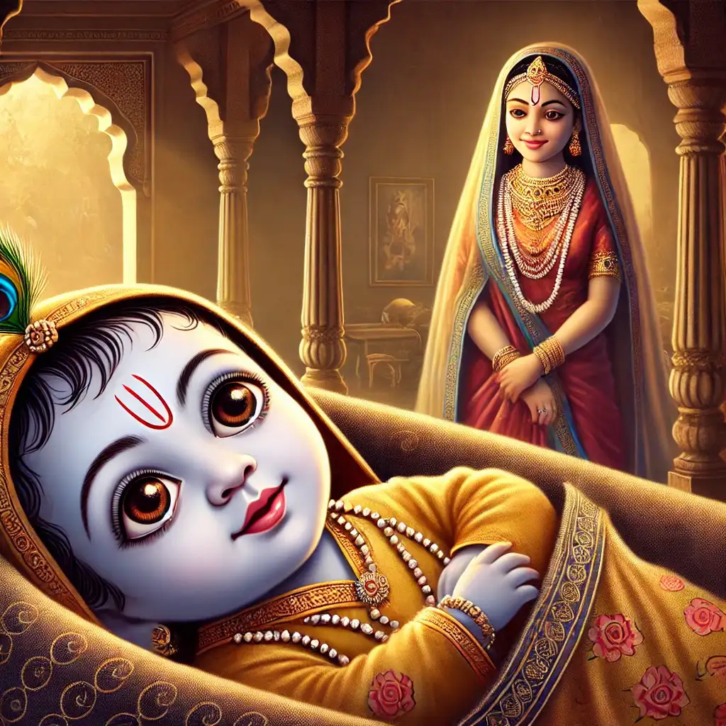 When Krishna was just six days old, Putna, a demoness sent by Kansa, entered Braj in the disguise of a beautiful woman. Her breast was smeared with deadly poison, yet she was able to walk into Nanda's home without suspicion. Without permission, she picked up baby Krishna and tried to feed Him.