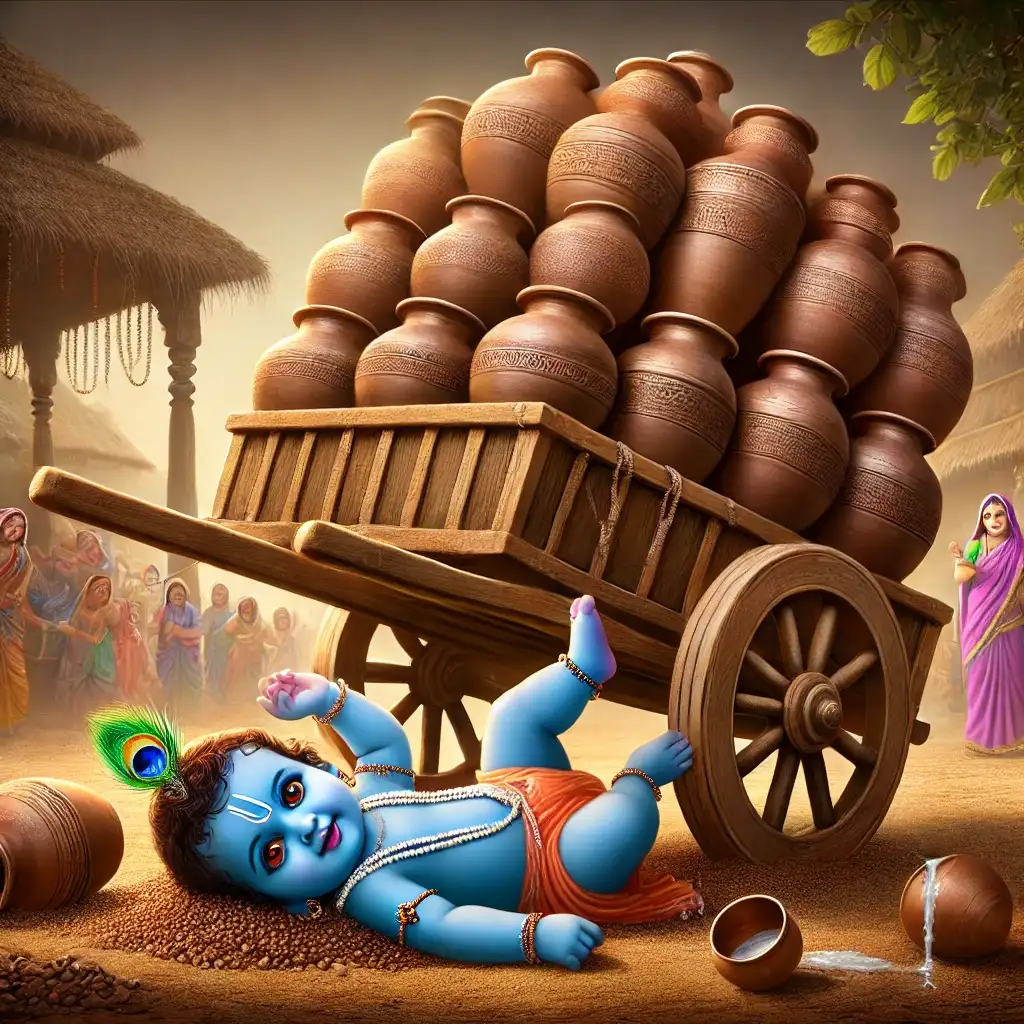 As baby Krishna lay beneath a cart loaded with utensils, the demon Shakatasura, sent by Kansa, concealed himself within it, planning to strike. Suddenly, Krishna casually raised His tiny leg and gave the cart a gentle kick. In an instant, the entire cart collapsed and the demon perished.