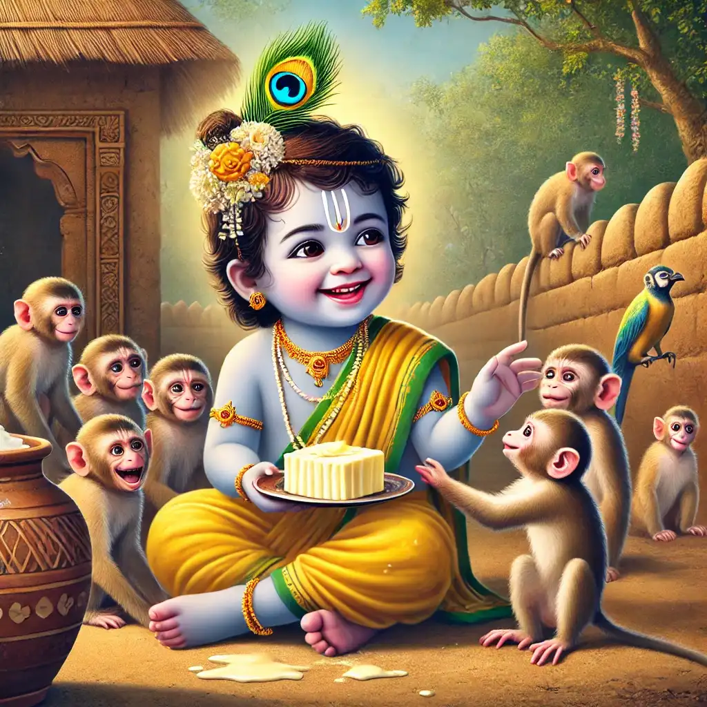 In one delightful episode, Krishna broke butter pots in the house and then walked outside, butter in hand, joyfully feeding it to a troop of monkeys. He spoke to them lovingly, as if they were lifelong friends sharing in His playful victory.