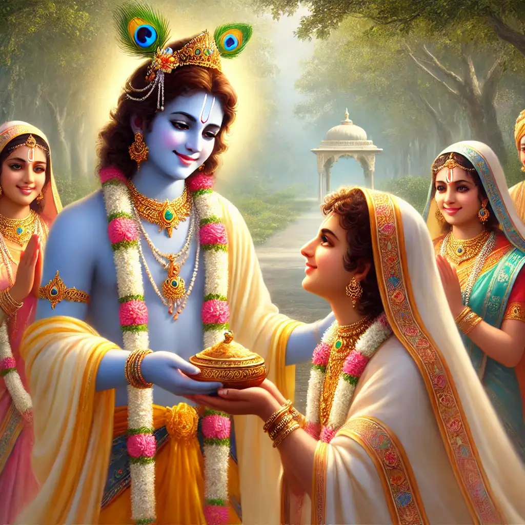 One day, Krishna and His friends were hungry in the forest. They approached the scholarly Brahmins, who were conducting yajnas, and requested food. The Brahmins dismissed them, saying, “Come after the ritual.”