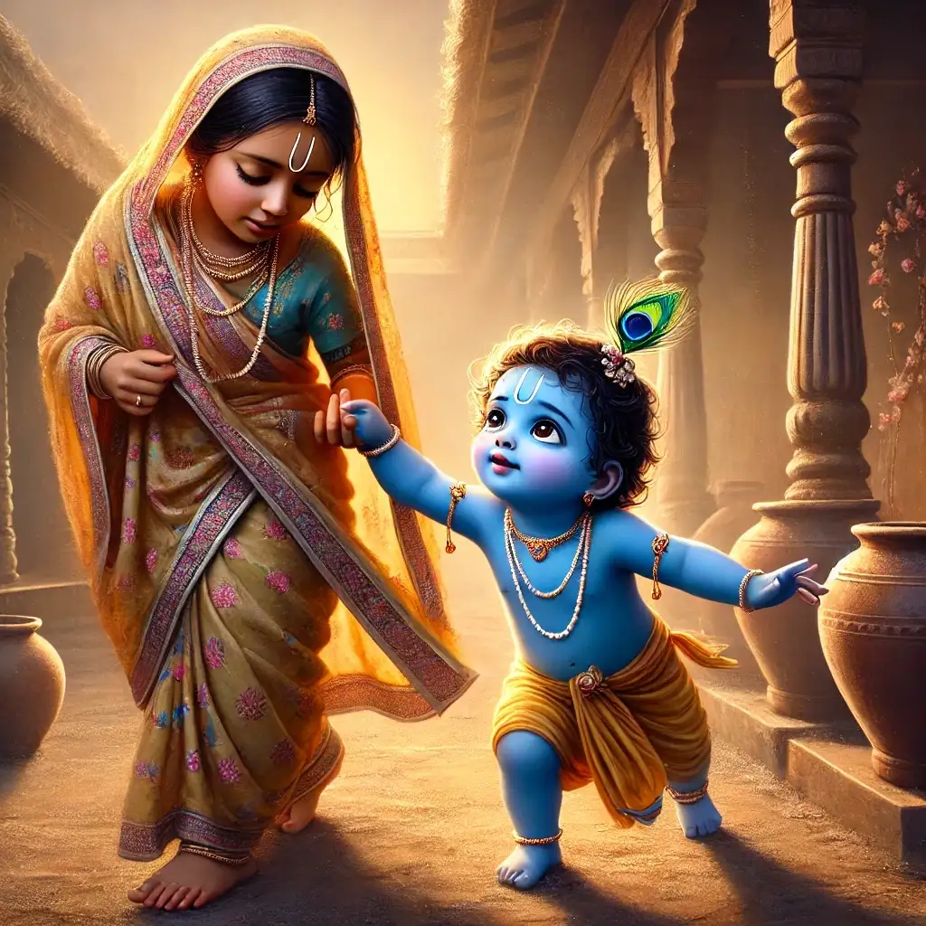 When Narad visited Nand's home, he saw Krishna tugging on Yashoda’s saree, begging to be picked up. Yashoda, in mock annoyance, refused. Narad was stunned.
