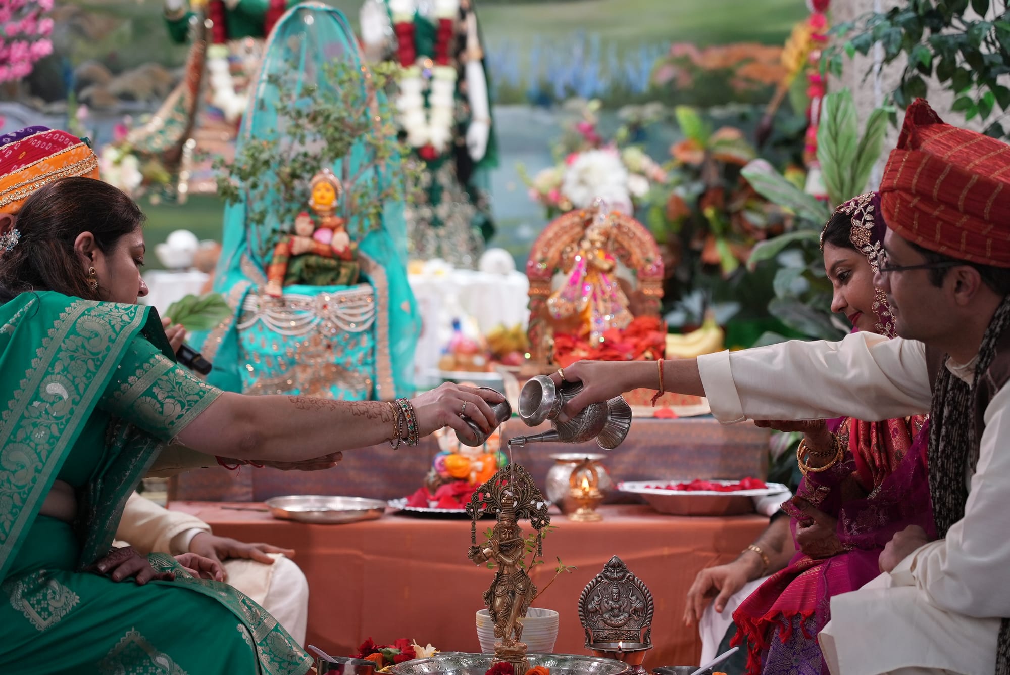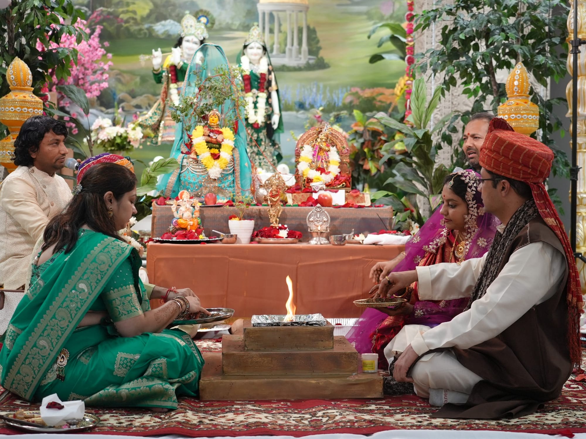 Wedding rituals conclude with devotees showering the newlywed couple with vermillion-mixed rice that symbolizes blessings for their union. Special vegetarian dishes and sweets prepared for the occasion become bhog when offered to the deities. Family members and visitors receive this blessed food as prasad, and each devotee consumes a Tulsi leaf that represents the goddess entering their body.