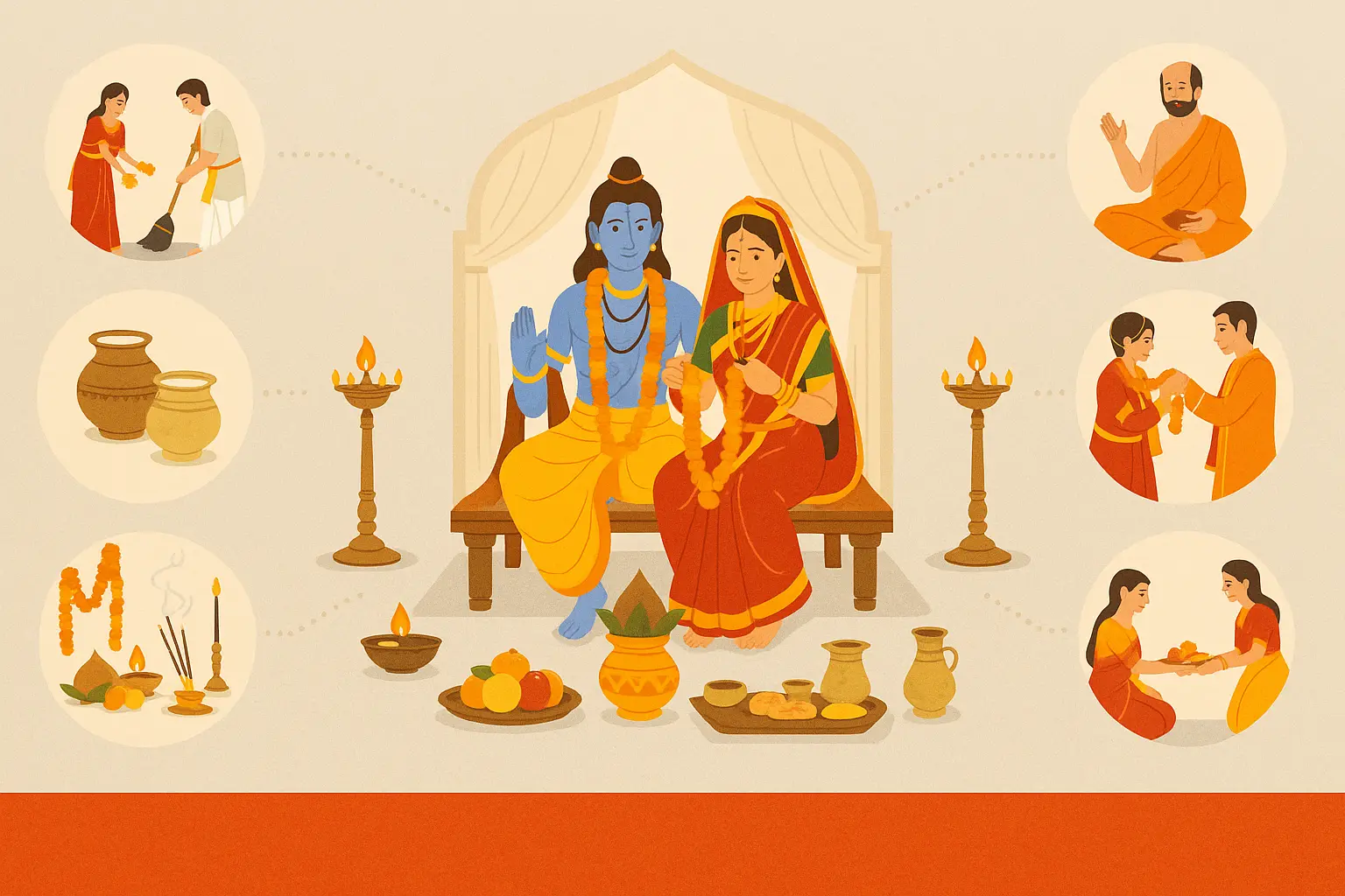 During Puja: Perform abhishek, aarti, recite Sita Swayamvar katha, and symbolically reenact the wedding.