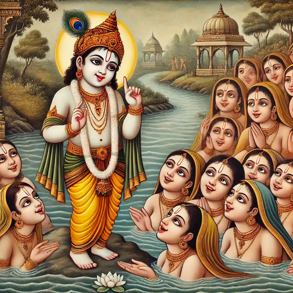 The Gopis, embodiments of pure devotion, had long nurtured intense love for Shree Krishna. Yet, a subtle residue of identification with the body still lingered. Attachment to the physical form is a significant impediment to spiritual realization. By orchestrating this Leela, Shree Krishna did not humiliate them; rather, he liberated them from bodily pride. Their emergence from the water represented their symbolic rebirth into a state of complete surrender.