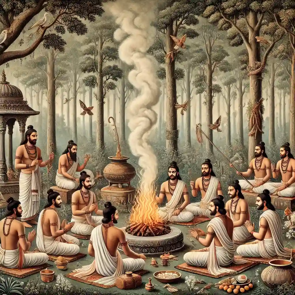 Feeling hungry, Shree Krishna prompted his friends (sakhas) to seek food from nearby Brahmins performing a Yagya (fire sacrifice ceremony). These Brahmins were the revered Chaturvedis of Mathura—scholars steeped in Vedic rituals and mastery of scriptures. The sakhas approached them respectfully, mentioning Shree Krishna and Balaram’s hunger. The Brahmins, deeply immersed in their rites, brusquely dismissed the boys. Their concern was the timing of the Yagya, not the hunger of the Supreme Lord himself.