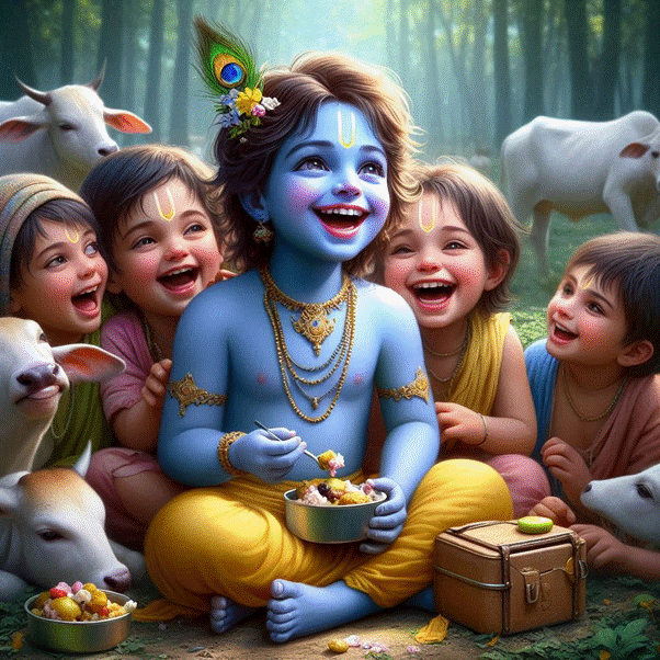 Each morning, Yashoda packed Krishna’s meal, and in the forest, He and His friends would share their tiffins together. Krishna would peer into another’s meal and ask, “What did your Maiya cook today? Let me have a bite!” The friend would frown in mock annoyance. “You greedy fellow! Always eyeing my food. Go eat your own lunch and stop begging like a bhikhari!” Krishna would laugh, delighting in being scolded like a mischievous child. If refused, He would reach over and snatch a morsel—sometimes straight from their hand, or even from their mouth—and eat it with utter joy. Then, licking His fingers, He would exclaim, “Wah! Your Maiya cooks better than mine. I must tell my Mother to learn from her!”