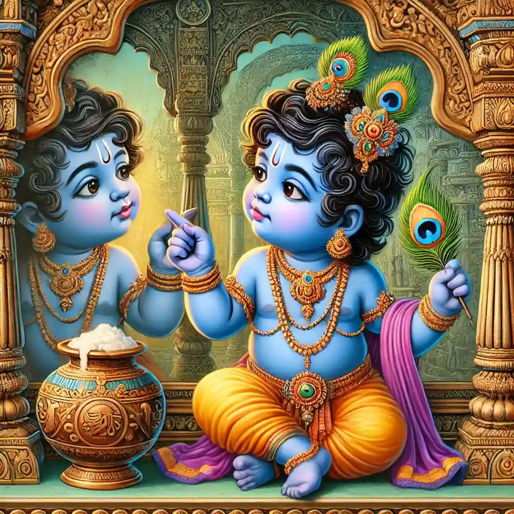 One day, while Mother Yashoda was in her prayer room, Shree Krishna found his way into the butter room. He joyfully began eating butter. As he did so, he noticed his reflection in a polished pillar. Thinking it was another child, possibly a guard placed by Mother Yashoda, he began interacting with it. He whispered and gestured, attempting to persuade his reflected companion not to alert his mother. He even tried to share the butter, convinced that this would keep him from being caught.