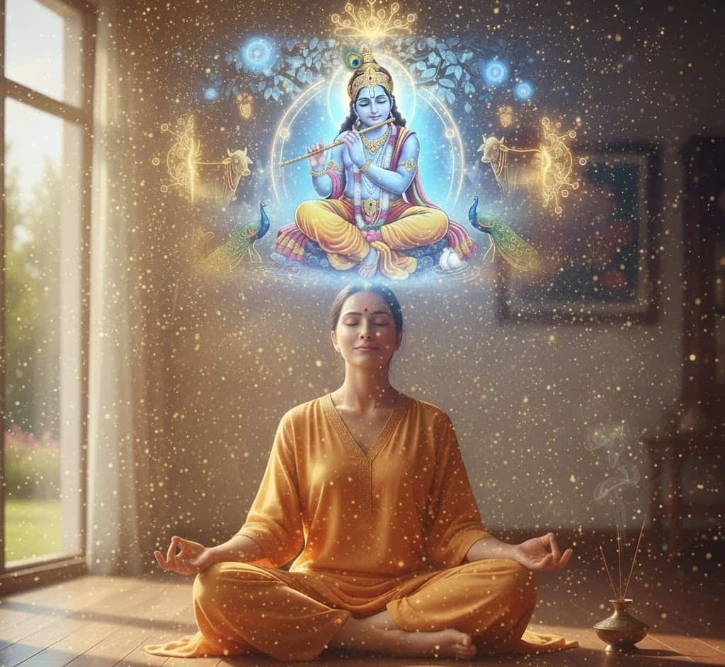 As you visualize Shree Krishna, allow feelings of love, gratitude, reverence, or surrender to arise naturally. There is no need to manufacture emotion. Even a gentle sense of closeness is sufficient.